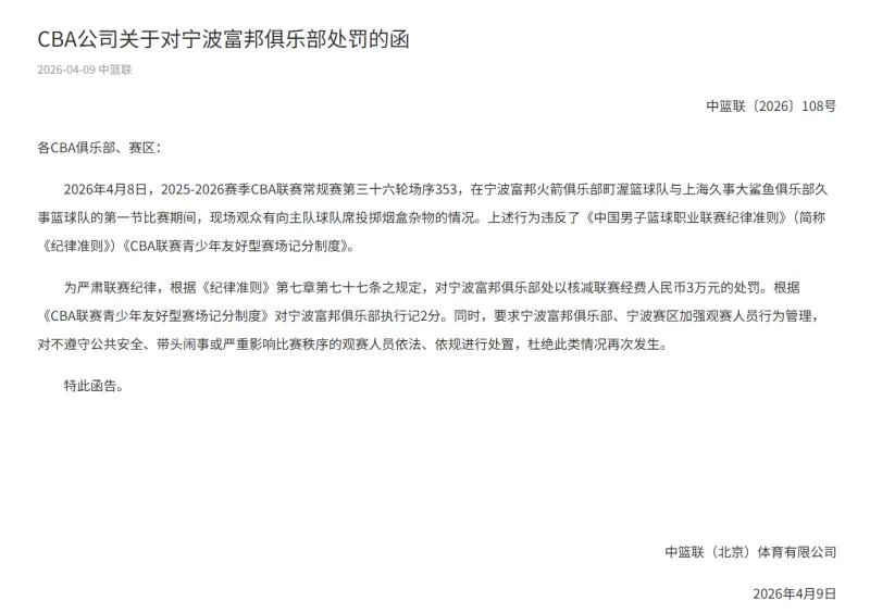 2026年4月8日,2025-2026赛季CBA联赛常规赛第三十六轮场序353,在宁波富邦火箭俱乐部町渥篮球队与上海久事大鲨鱼俱乐部久事篮球队的第一节比赛期间,现场观众有向主队球队席投掷烟盒杂物的情况。上述行为违反了《中国男子篮球职业联赛纪律准则》(简称《纪律准则》)《CBA联赛青少年友好型赛场记分制度》。